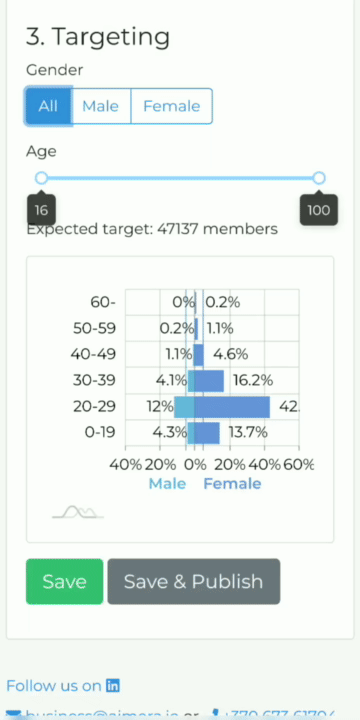 To optimize challenge performance you can offer it to a particular segment. Gender and age of participants can be targeted. The challenge targeting can be updated on the go if you change your mind. Just set age range and gender when managing a challenge in Aimera business panel